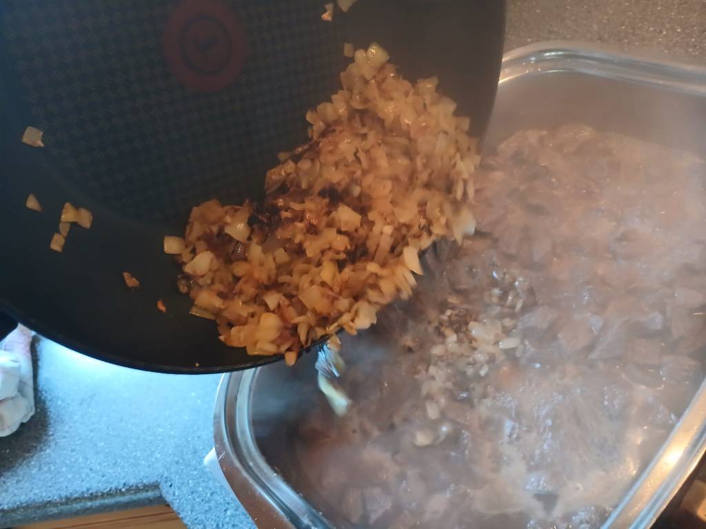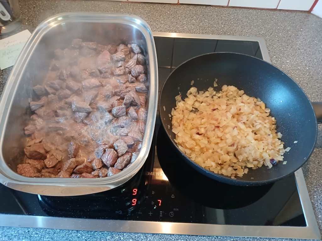 13:33 Uhr – Jetzt gehts los – Fleisch und Zwiebeln gleichzeitig – mit ein bisserl Hektik 🙂 Die Pfanne ist gut vorgeheizt und freut sich sofort über die gehackten Zwiebeln. Aufpassen, daß die Zwiebeln nicht anbrennen. Hin und wieder rühren. Daneben im Bräter schmilzt derweil schon das Butterschmalz. Wenn die Zwiebeln langsam die Farbe wechseln, drehen wir beim Bräter richtig hoch. Das Fleisch steht daneben und wartet schon. Unser Gefühl weiß, daß jetzt der Zeitpunkt da ist, wo das Fleisch in den Bräter muß.