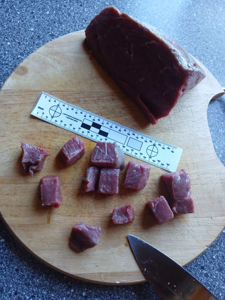 Das Fleisch: Um es leichter bearbeiten zu können haben wir die 1734 Gramm ersteinmal geviertelt und in einem Suppenteller zwischengelagert. Die Haut und mögliche „Flachsen“ haben wir für die braune Tonne entfernt. Jetzt gehts an die richtige Größe. Wir haben exakt 2,8 cm große Fleischstücke geschnitten.