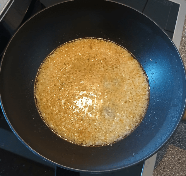Jetzt werden die Knofi-Zehen freigeschält und anschließend richtig kleingehackt. Das gehackte Ergebnis kommt mit 2 EL Olivenöl in die Bratpfanne und darauf der Glasdeckel. Die Abfälle entsorgen.