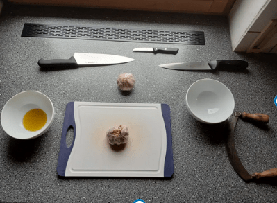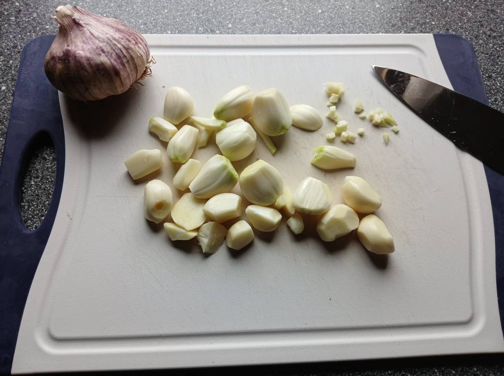 Der Knofi: Zuerst die schwarzen Einmalhandschuhe anziehen, das Schneidbrett wässern oder eins aus Kunststoff nehmen, den Knofi neben das Brett legen, ein scharfes Messer vorbereiten und eine Schüssel für die Abfälle für die braune Tonne 😉