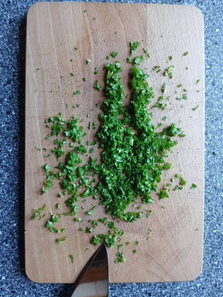 Inzwischen holen wir uns Petersilie aus dem Garten und hacken die Hand voll klein, aber nicht in der Hand sondern auf unserm Holzbrett. Die gehackte Petersilie brauchen wir erst später. Also wieder kühl und abgedeckt zur Seite stellen.