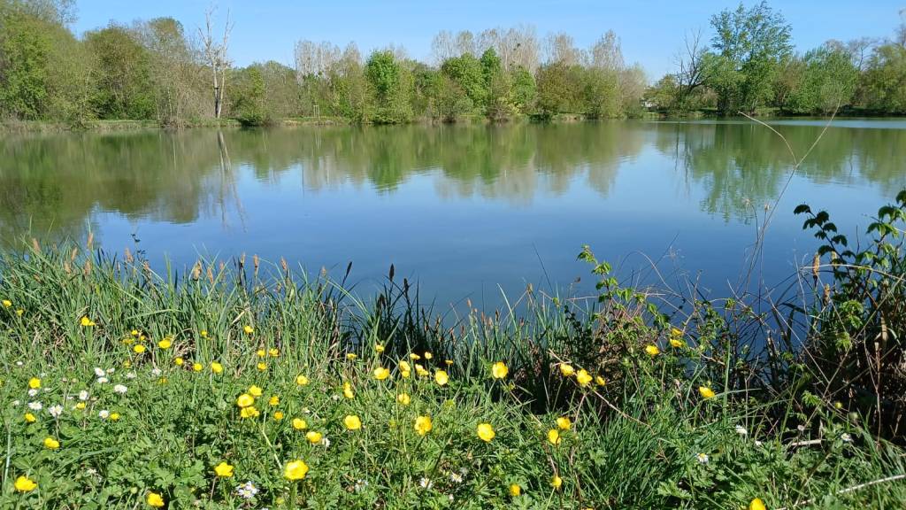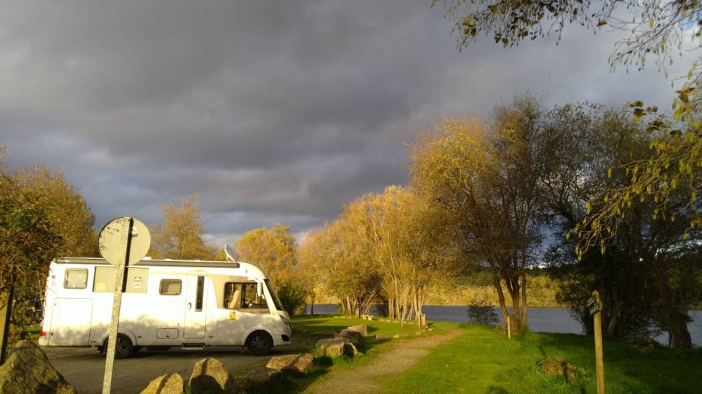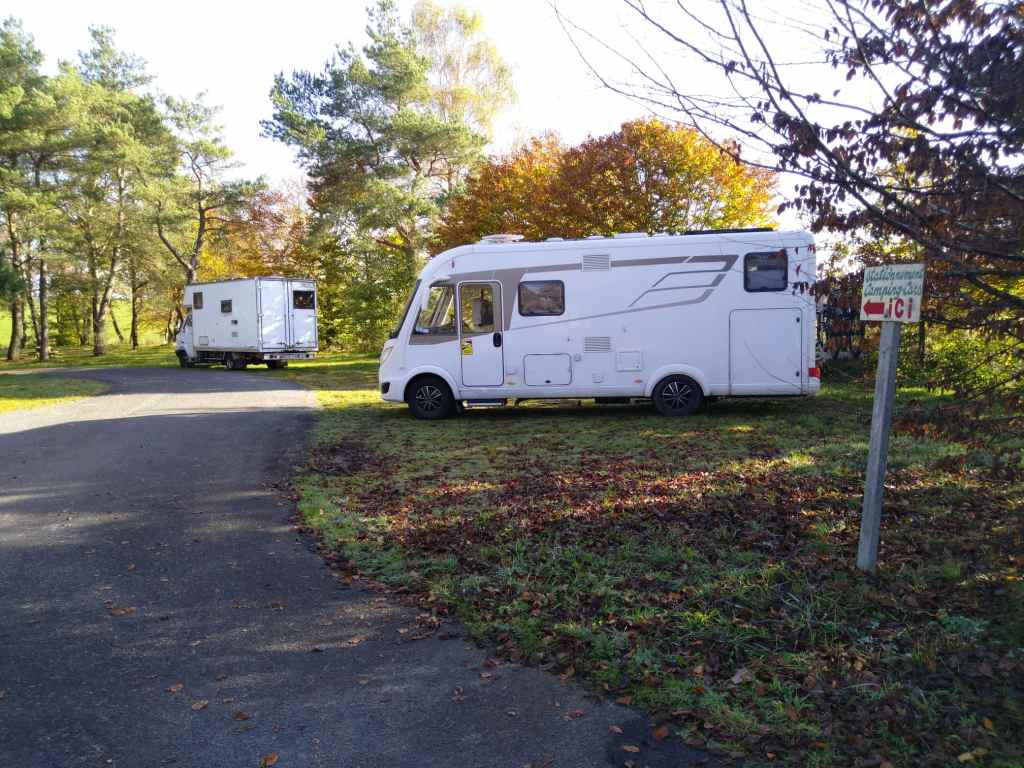 Wenn die Sonne scheint, dann ist dieser kostenlose Platz wunderschön. In der Nacht ist es abhängig vom Mond stockfinster. Dann sieht man etwas entfernt das schwache Licht der V/E und die Sterne über einem. Laternen gibt’s, die sind aber jetzt im November nicht in Betrieb. Für Angler scheint der 150 m entfernte See ein Paradies zu sein. Rund um sitzen welche am Ufer.