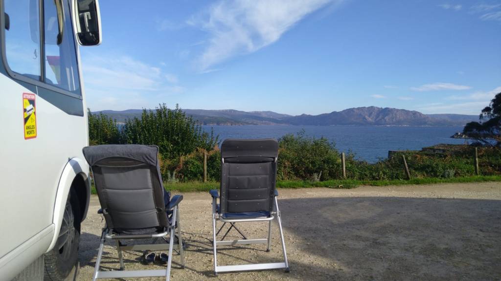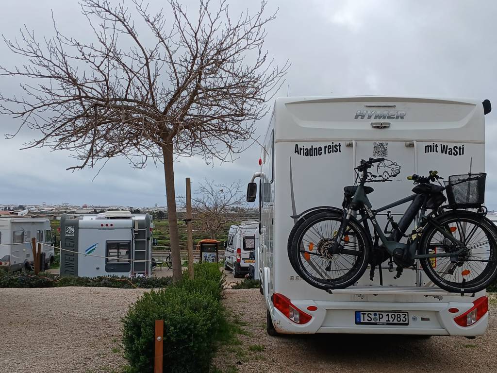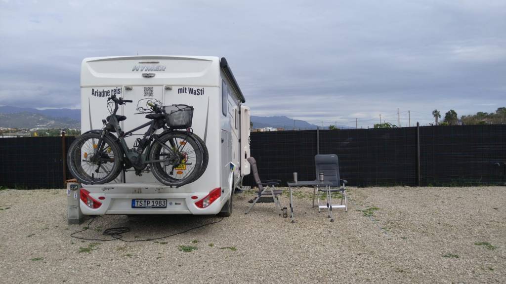Neulich war Ariadne wie schonmal 2023 wieder in Spanien auf dem Stellplatz in Fisterra, der inzwischen 10 € kostet und für weitere 3 € noch Strom dazu gibt. V/E ist inklusive. An der Rezeption trifft man auf Santiago oder ruft ihn an, falls er nicht da ist. Er hilft bei allen Problemen und ist supernett. Wieder stehen wir mit Blick aufs Meer. Santiago hat uns hohe Holzkeile gegeben, so daß die Schräge des Geländes gut ausgeglichen werden kann.