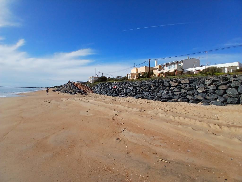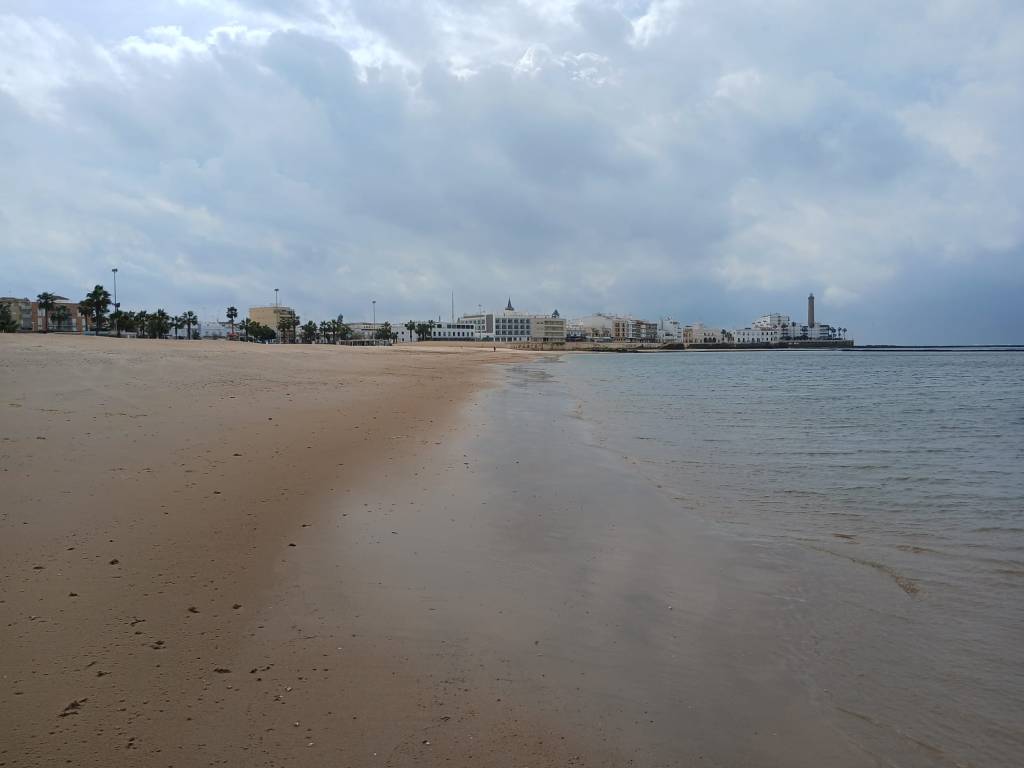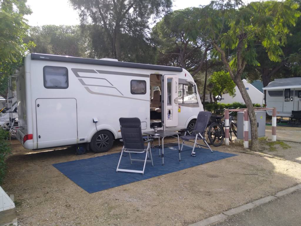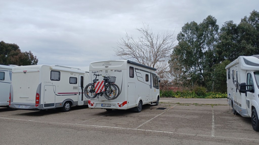 und schlafen trotzdem relativ gut. Es ist wie an einer Raststätte, nur sicherer. Der Stellplatz kostet im Winter 5 Euro (im Sommer 10) und bietet V/E an. Bezahlt wird am Automaten mit Karte oder Münzen. Auf Promobil wird er immer noch als kostenlos geführt. Bis zum Strand sind es 1,5 Kilometer zu Fuß. Unweit vom Stellplatz gibt es einen Discounter und im Ort finden wir eine Repsol-Tankstelle. Mal schauen, ob wir da vorsorglich eine spanische Gasflasche samt Adapter auftreiben können.