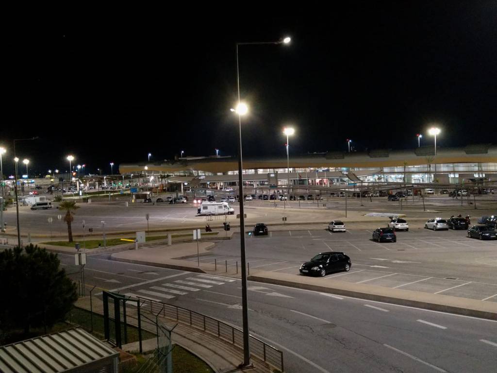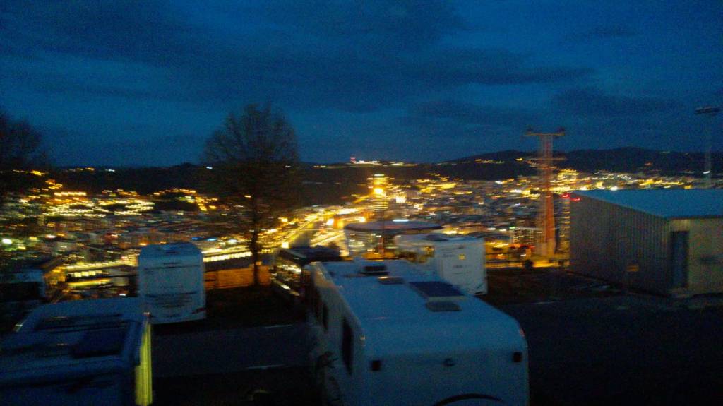 Auf unserm Weg dorthin verlassen wir die touristischen Bereich und kommen in Hintergäschen, die zwar sehr interessant sind, aber auch ein wenig an die Reeperbahn oder manche Ecken in Frankfurt am Main erinnern. Nicht jeder, der uns begegnet, ist nüchtern und an manchen Häusern lehnen junge Damen. Vermutlich sind das Bauwärterinnen, die schauen, dass das Haus nicht umfällt. Schließlich erreichen wir den Bus genau 1 Minute vor Abfahrt, als hätten wir das geplant. Reiner Zufall. 40 Minuten später steigen wir am Stellplatz aus. Langsam wird es schön dämmerig und als später die Stadt voller Nachtlichter ist, gefällt uns der Ausblick schon sehr gut.