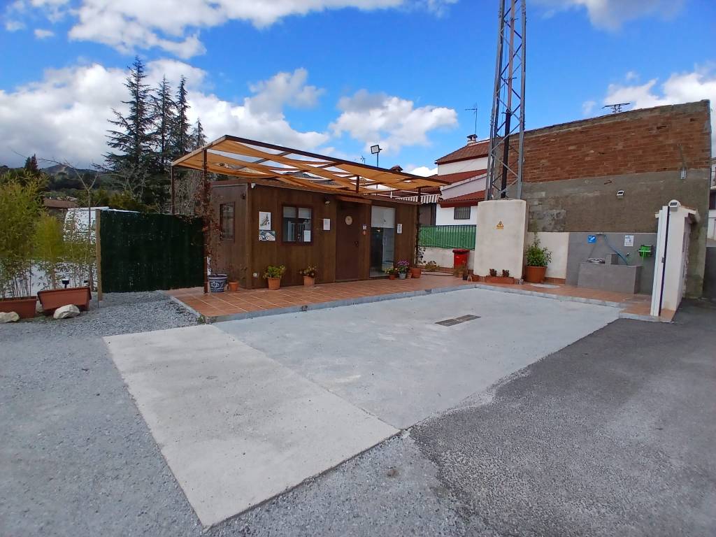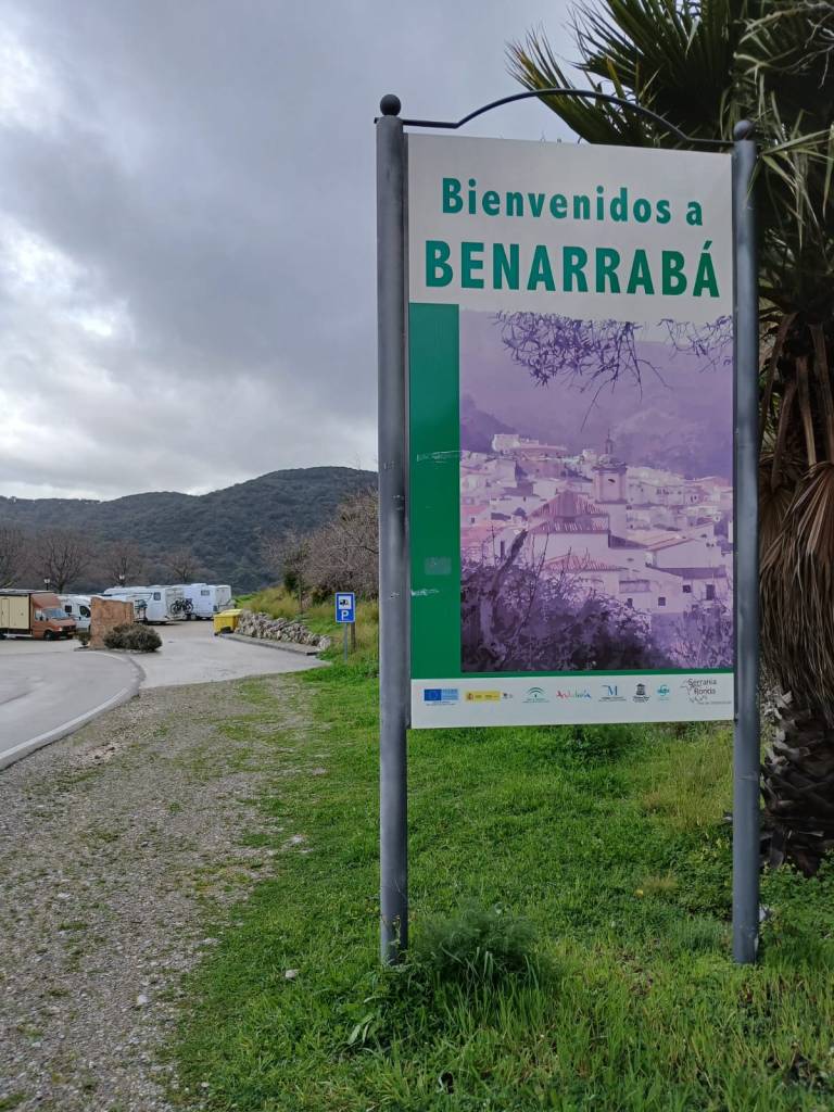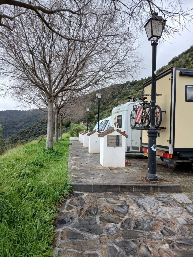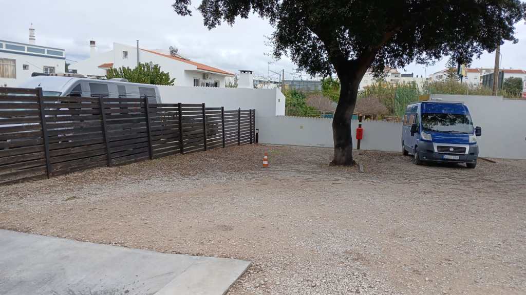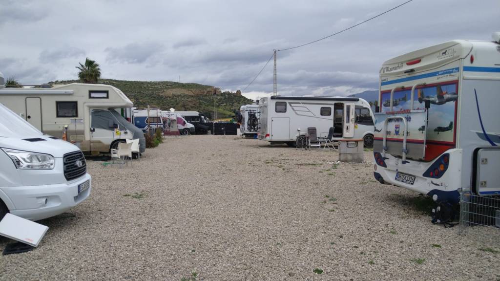 Abgesehen davon gibt es neben den 19 geteerten Plätzen samt Entsorgungsstelle auch noch über 40 geschotterte kostenlose Plätze. Das Schild an der Zufahrt erklärt auf spanisch, daß auf dem Schotter das Zelten zwar verboten ist, aber Wohnmobile 48 Stunden stehen dürfen. Wir standen auf einem geteerten Platz, der etwa 3,50 m breit und 8 m lang ist. Der Platz ist nachts gut beleuchtet. Nur wenig Verkehr läuft vorbei und selten fährt ein leiser Zug vorbei.