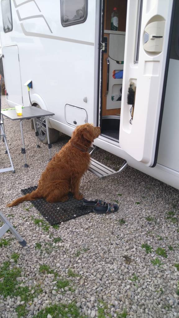 Der Platz liegt unterhalb der Burg und ist nicht eingezäunt. Eine Gassirunde und die Nationalstraße, die uns hierhergebracht hat, führt vorbei. Uns stört der Verkehr aber nicht sonderlich.