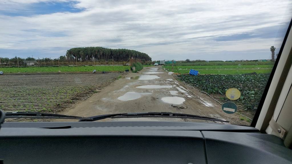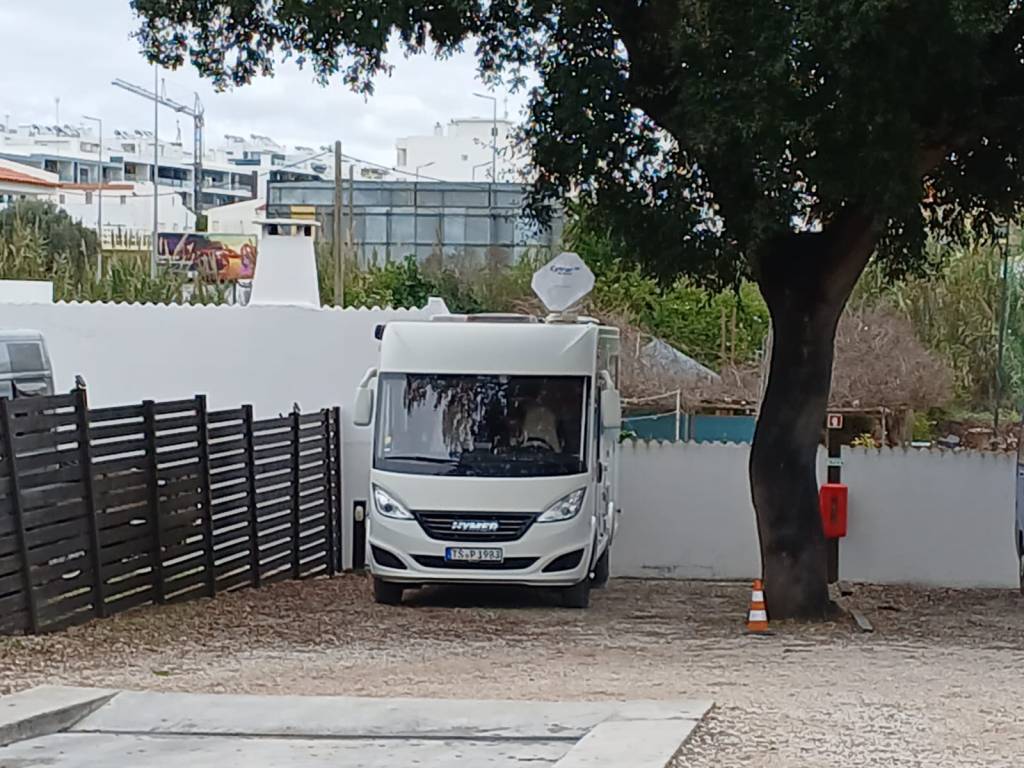 Neben dem Platz stehen kleine Häuser, Offenbar Ferienhäuser. Daneben gibt es eine Bar, die jetzt im November geschlossen hat. Um fast gerade zu stehen haben wir einen Keil gebraucht. Unsere Sat-Schüssel fand durch die Bäume