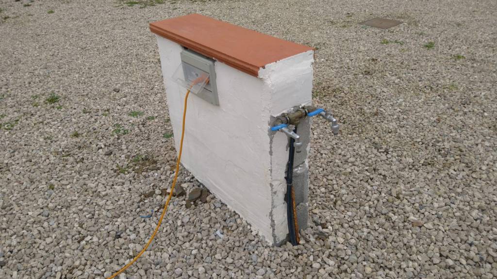 An jedem der 70 Stellplätze ist ein Stromanschluß. Trinkwasser gibt es am sauberen Sanitärgebäude, das neben Toiletten auch Duschen und kleine Waschräume beherbergt. Dort ist auch eine Waschmaschine, die für 2 Euro 45 Minuten lang die Wäsche wieder sauber macht. Man merkt halt, daß der Stellplatz ein ehemaliger Campingplatz ist. Daneben ist Platz zum Abspülen und außerdem ist da auch ein Platz für Boule/Botcha/Mölkky usw.
