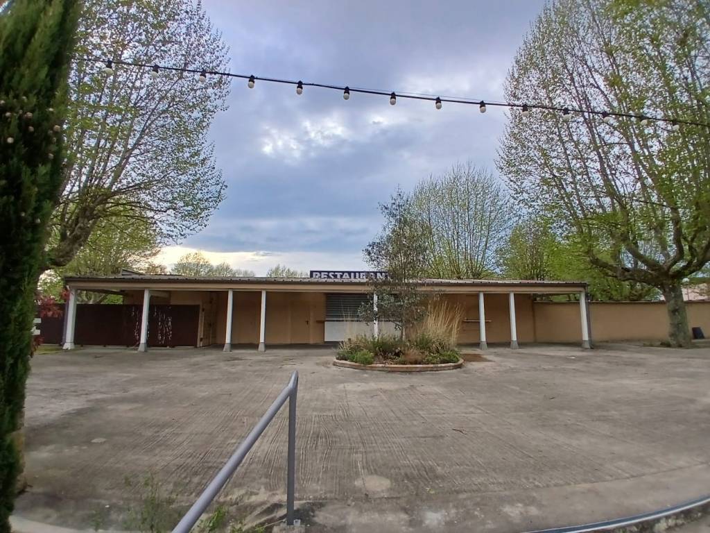 Der beleuchtet Platz ist rundum eingezäunt. Zwar gibt es die Sanitärgebäude des ehemaligen Campingplatzes noch, aber die sind allesamt abgeschlossen. Genauso ist es mit dem leergeräumten Rezeptionsgebäude. Kann sein, daß im Obergeschoß noch eine Wohnung ist. Das Restaurant am Saone-Ufer hat (noch?) geschlossen. Wir wissen nicht, ob es in der Saison öffnen wird.