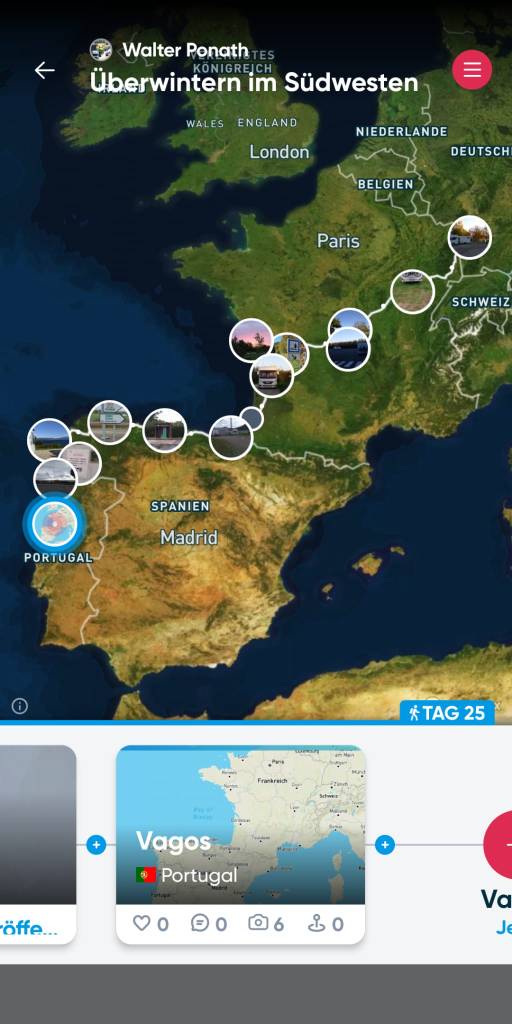Neulich im November 24 war Ariadne für eine Nacht an der portugiesischen Atlantik-Küste auf einem Parkplatz in Vila Praia de Ancora gestanden. Mit What3Words findet Ihr hierher, wenn Ihr „Erlebnisse.Geburtsstunde.Oberer“ eingebt.