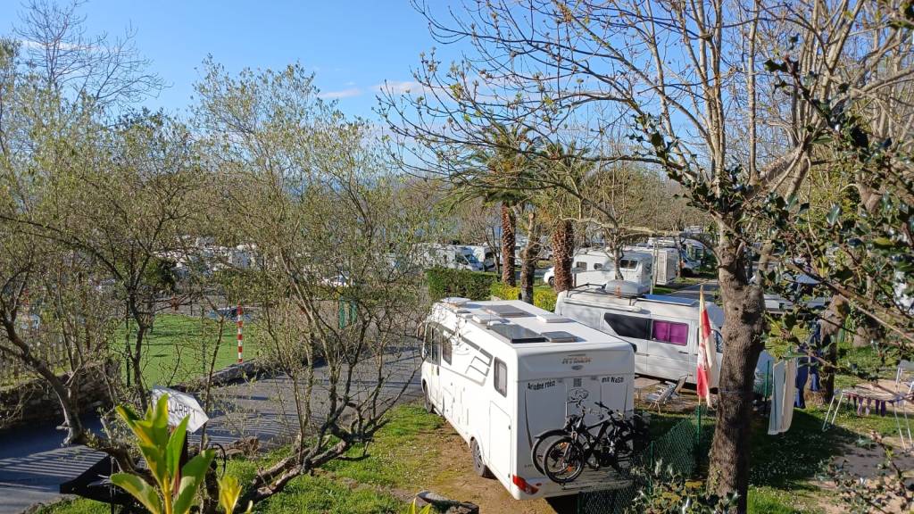 Es gibt zwei Entsorgerplätze nahe der Einfahrt. Da sollte man lieber ein paar Meter weiter weg stehen, weil es da zuweilen etwas riecht. Einige Plätze sind gekiest, manche sind Wiese. Wir zuletzt im April 23 ist der Platz auch jetzt im November 24 lange nicht voll besetzt, so daß jeder einen Doppelplatz nutzen und die Stühle rausstellen kann, obwohl etwa die Hälfte des Platzes aktuell im Winterhalbjahr gesperrt ist. Außer uns sehen wir nur französische Kennzeichen.