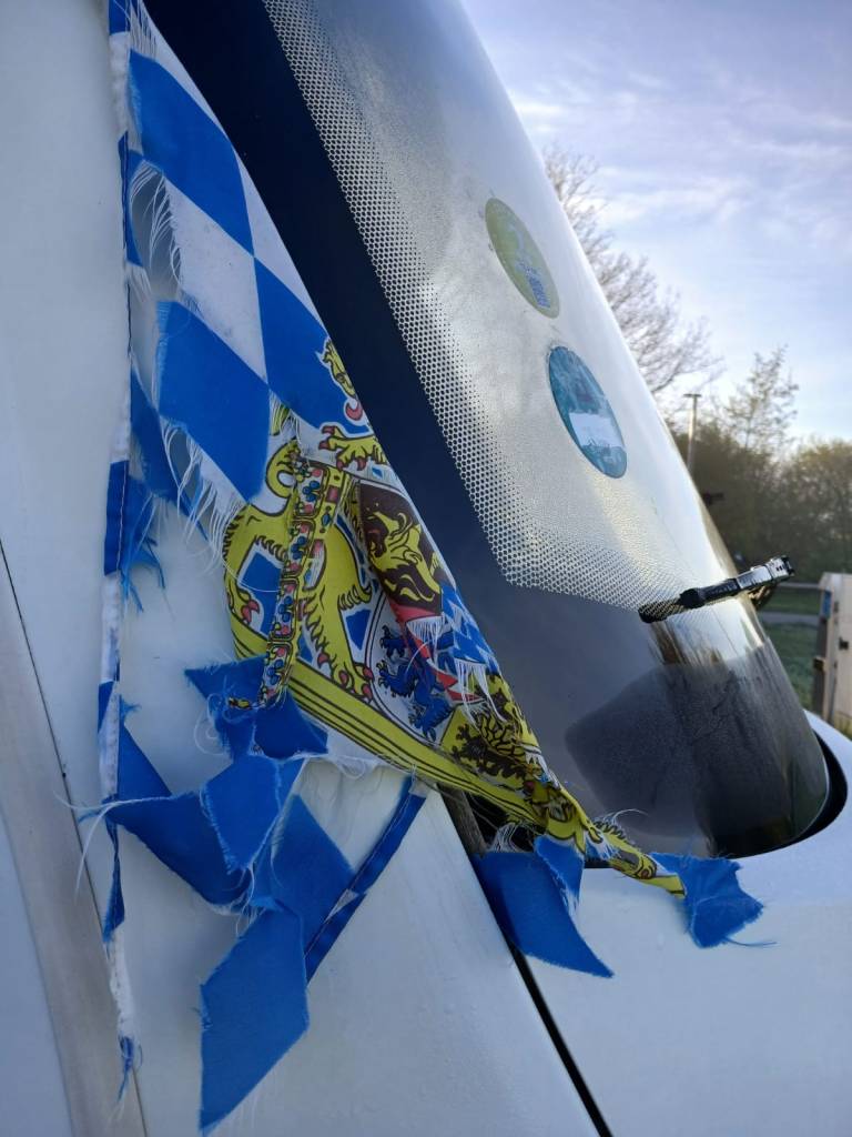 und gerade hat es trotz Sonnenschein nicht mehr als nur 1 Grad Celsius am Stellplatz. Unsere treue Bairische Fahne ist am Auto festgefroren. Aber die Sonne wird jetzt dann schnell alles aufwärmen.