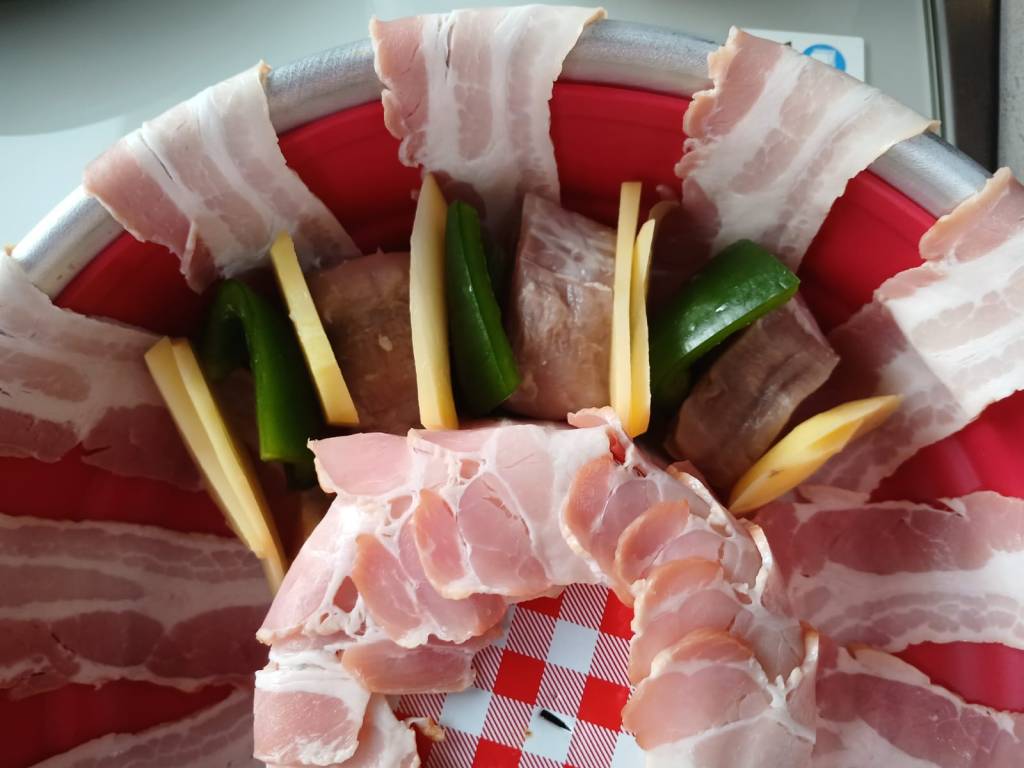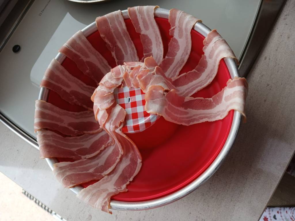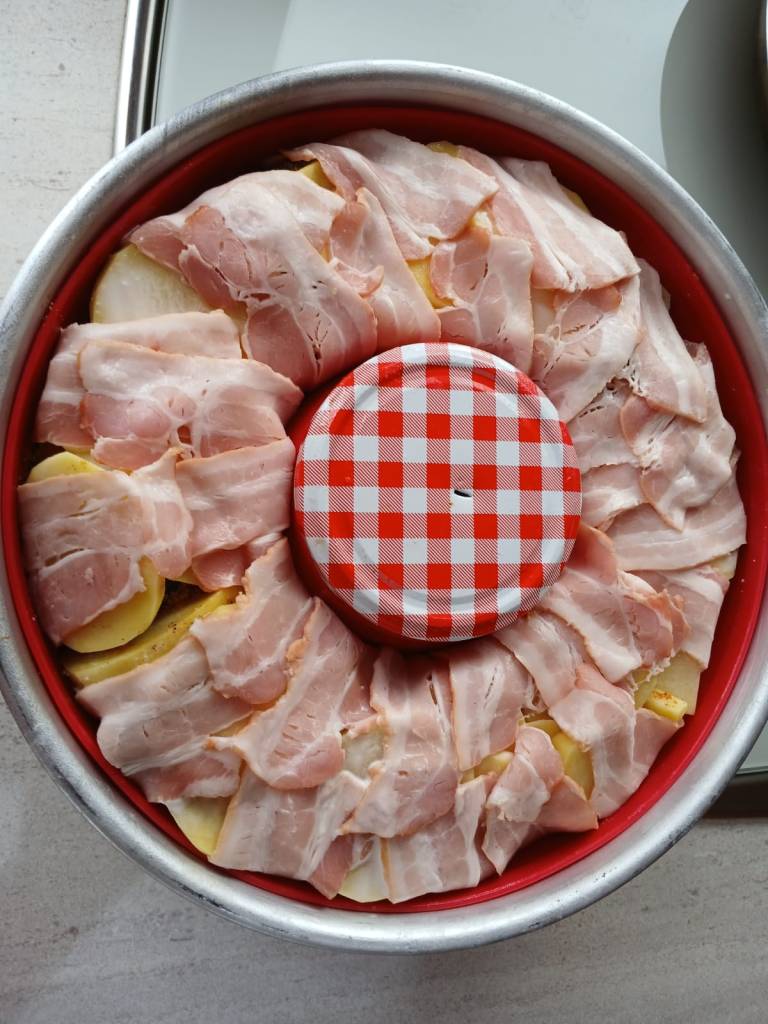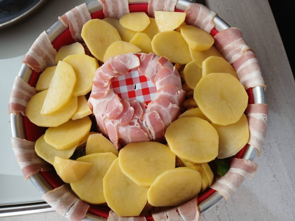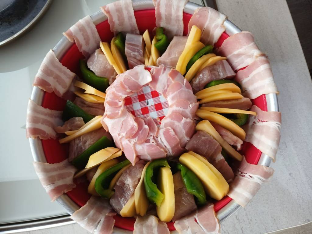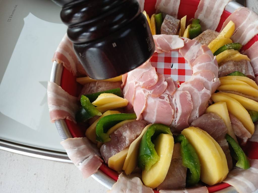 Auf die Speckscheiben legen wir rundherum die Kartoffelscheiben, den Paprika und Scheiben eines 300-400 Gr. schweren Schweine-Filets… So sieht es dann aus