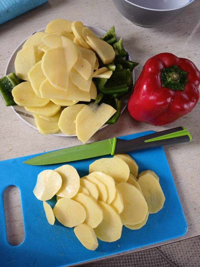 Wir schneiden 1 grünen Paprika, den wir in Scheibenstücke schneiden und 1 roten, einfach nur, damit aufm Bild mehr Farbe ist. Die 3 Kartoffeln schneiden wir in dünne Scheiben, schließlich brauchen die Erdäpfel mit zunehmender Dicke immer ein bisserl länger…