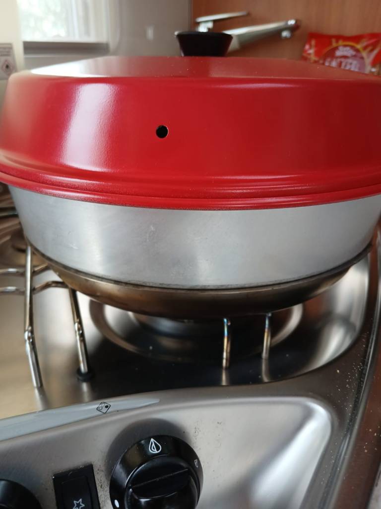 15:47 Uhr – es geht los. Seht Ihr? Der Deckel in der Mitte ist weg. Durch die Öffnung soll ja die Hitze aufsteigen können. Sonst ist das ja kein Backofen.