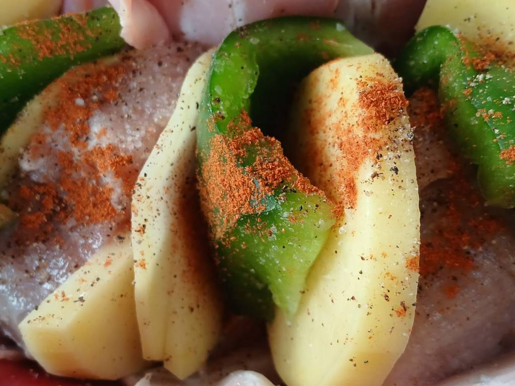 Ihr braucht einen grünen Paprika, drei Kartoffeln, 350 Gr. Schweinefilet, 200 Gr. Speck, ein bisserle Sahne, dazu noch Salz, Pfeffer und Paprikapulver…