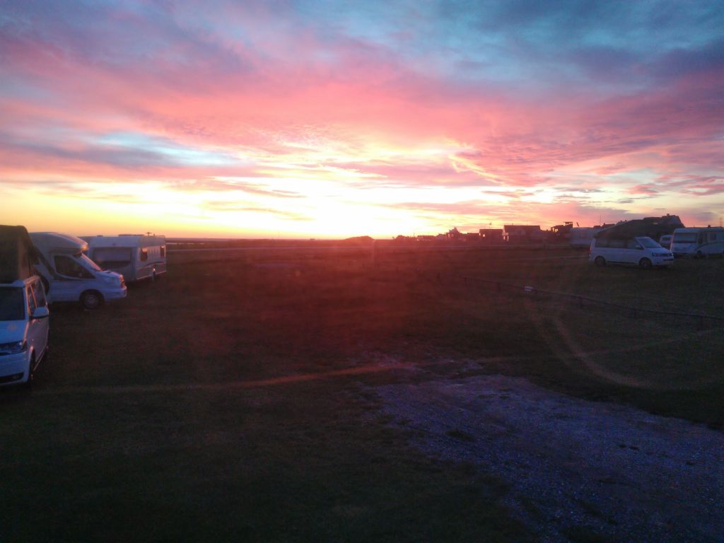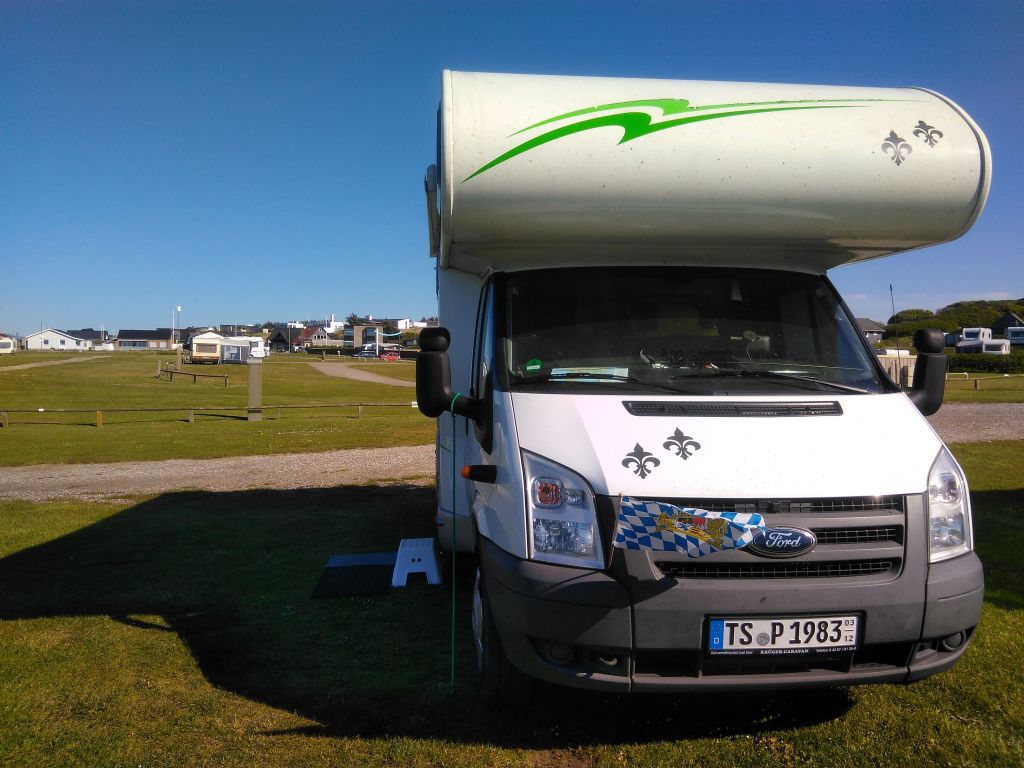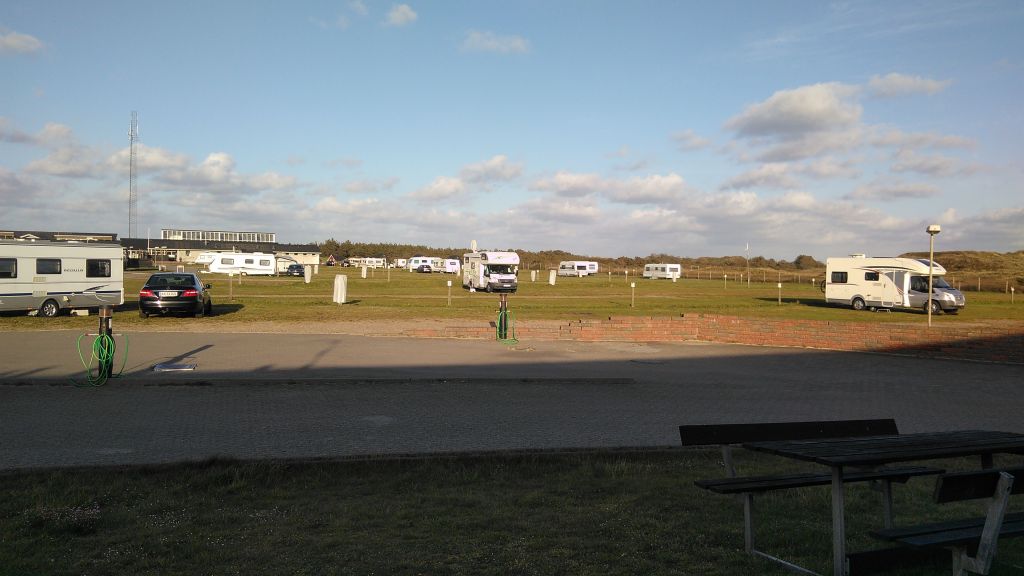 Weil noch wenig los ist, sind sehr viele der 420 Plätze frei. Wir dürfen mit dem vergünstigten Preis sogar in die erste Reihe gleich hinter der Düne. Neben uns steht dort schon ein Ehepaar aus Lübeck mit einem Leihwohnmobil, das sie günstig mieten konnten.