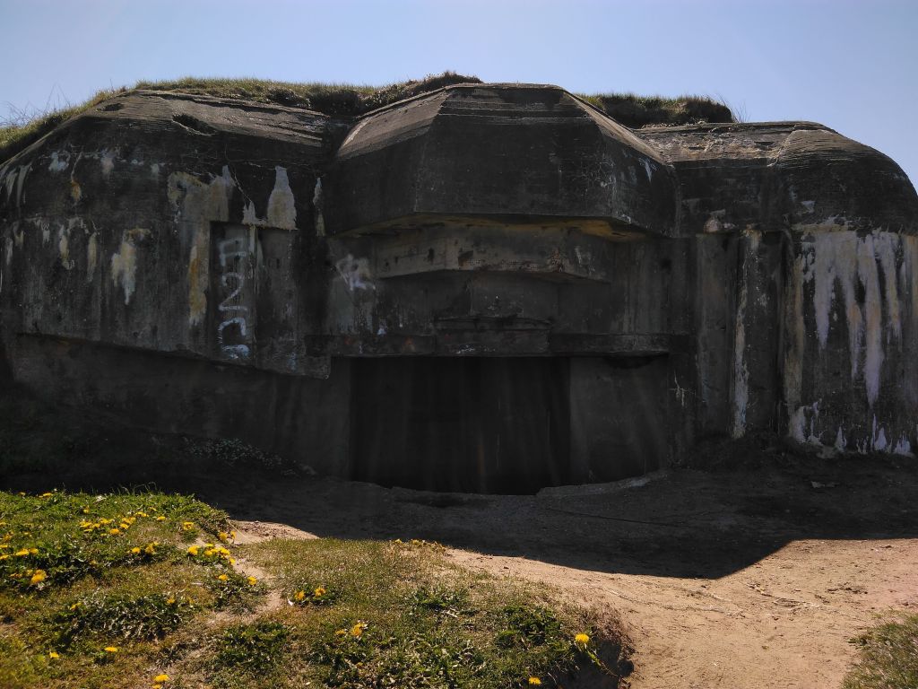 Kaum steht unser Auto, machen wir auch schon unsern ersten Strandspaziergang zum Leuchtturm. Auf dem Weg dorthin passieren wir wieder einige Bunker. Sogar auf dem Strand, halb im Meer, liegen einige dieser schwer zerstörbaren Mahnungen.
