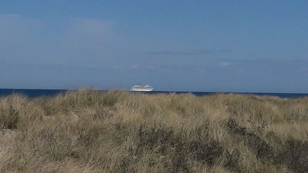 Unser letzter Tag an Dänemarks Nordspitze läßt uns wieder aufs Radl steigen. Außerdem bummeln wir nochmal durch Skagen. Glogs für 600 Dänische Kronen bleiben im Handel und auch Nutella (im Sonderangebot umgerechnet 6 Euro) bleibt für den nächsten Kunden im Regal. Den Hafen haben wir auch nochmal besucht. Nach einer Mittagspause im Campingstuhl sind wir mit Paula nochmal an den Nordseestrand gewandert. Der ist wirklich endlos. Sogar ein Kreuzfahrschiff haben wir gesehen.