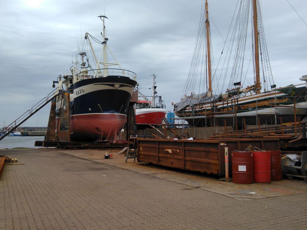Gleich zwei Feiertage gibt es heute und so natürlich auch viele Camper, die auf den Platz drängen. Norwegen feiert die Staatsgründung. Dänemark hat den Buß- und Bettag. Vermutlich deshalb hat der Super Brugsen heute geschlossen. Oder ist er ebenso Pleite wie der dänische NETTO in Hirthals – til salg (zu verkaufen) steht an der Tür. Im Hafen beeindrucken uns die Schiffe, auch die Boote im Trockendock.