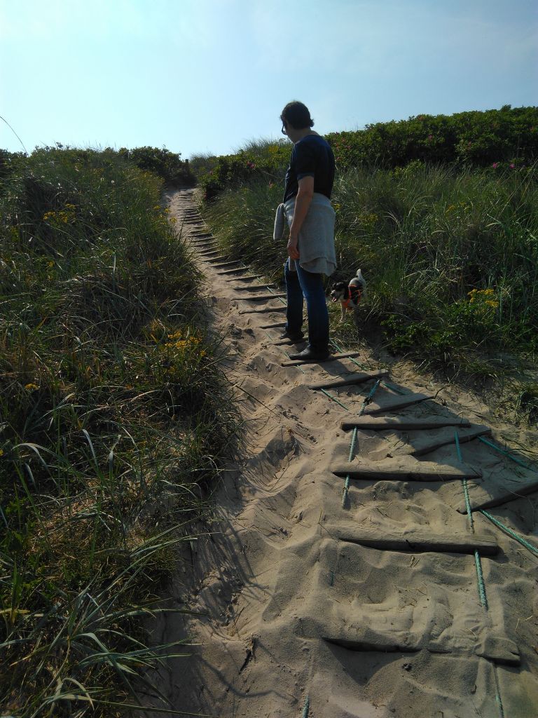 Auf der Düne hoch zum Turm fühlt sich das Gehen seltsam an. Fast wie im Tiefschnee. Wir lassen es uns auch nicht nehmen, den etwa 8 oder mehr Meter hohen Sandhang runter zu rutschen. Kleine Sandlawinen begleiten uns auf dem Weg nach unten.