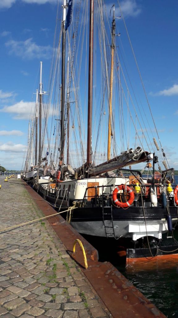 Wir genießen einen schönen Spaziergang. Zwei freilaufende Hunde wollen unsere Paula provozieren. Das kommt ihr gerade recht, aber am Ende geht es ohne Beißen weiter. An einer Mole liegen einige ältere beeindruckende Segel-Schiffe mit viel Holz.