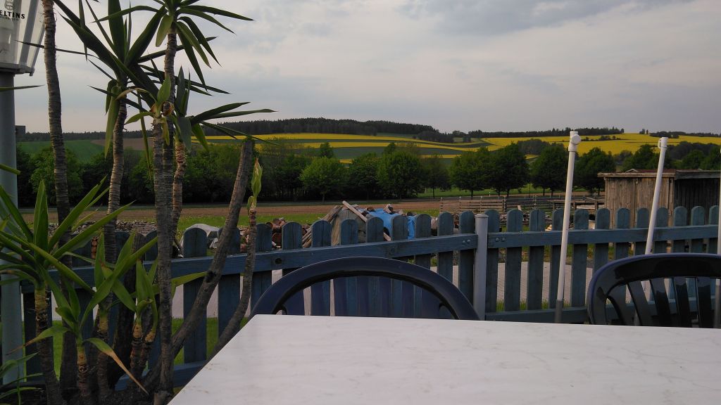 Hier ist es total ruhig. Die Vögel singen ihre Lieder und die Sonne scheint auf uns. Abends nutzen wir für 2 Stunden das günstige Feierabend-Ticket. Neben den Thermalbädern nutzen wir auch das Kneipp-Tauchbecken und verlassen schließlich das Bad erholt nach 1 Stunde 57 Minuten wieder. Wir gönnen uns ein Essen im Minigolf-Lokal gleich am Stellplatz. Mit der Gästekarte gibt es 2019 noch Anspruch auf einen Kuchen. Wir nehmen auf der Terrasse Platz. Zwar müssen wir mit Ansage etwa 1 Stunde aufs Essen warten, aber das macht uns nichts aus. Wir wissen ja, daß es üppig und wirklich gut ist. Kaum zu schaffen.
