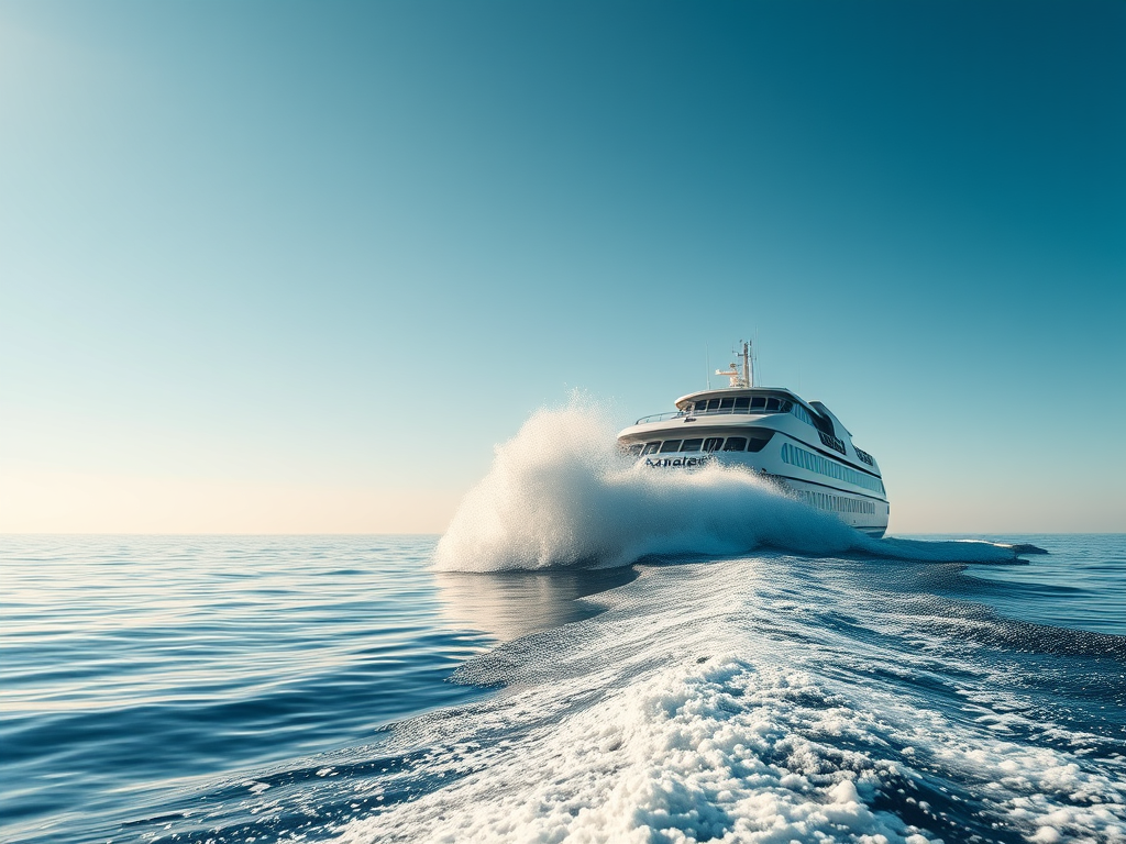 Die Fahrt beginnt erst einmal ganz gemütlich. Stine bleibt im Auto bei Paula. Ich geh hoch zur Reling und genieße die Fahrt. Das Wetter ist gut. Das Boot fährt zielstrebig in Richtung des anderen Ufers. Da seh ich von links (das ist backbord hab ich gehört) eine einzelne Welle langsam auf das Boot zukommen. Ich würde sagen etwa 1 m hoch, wenn nicht mehr.