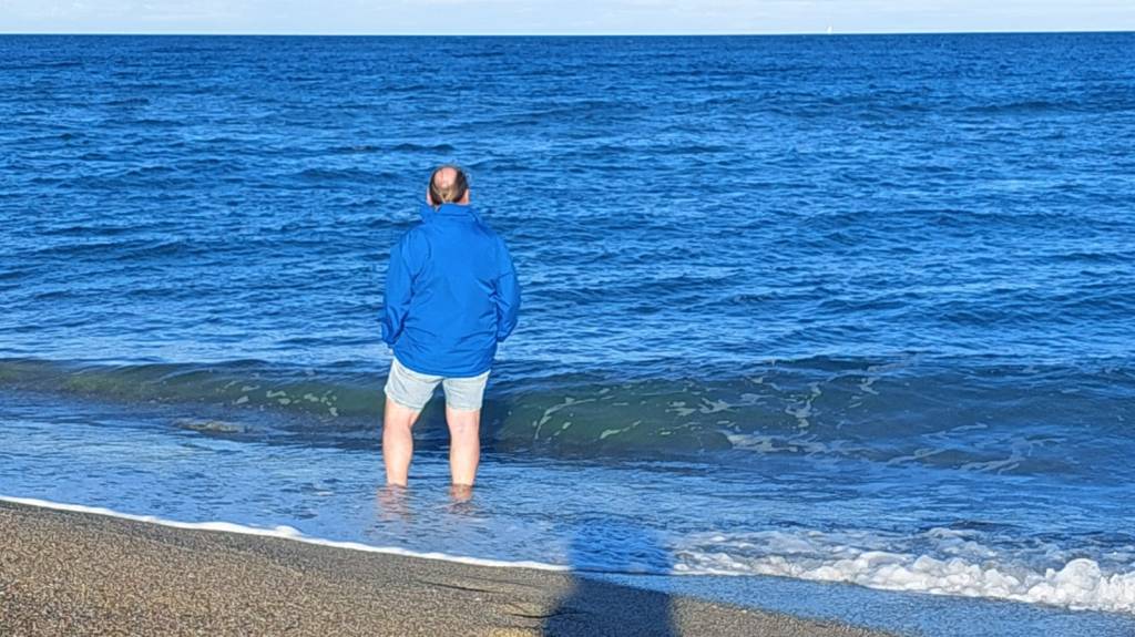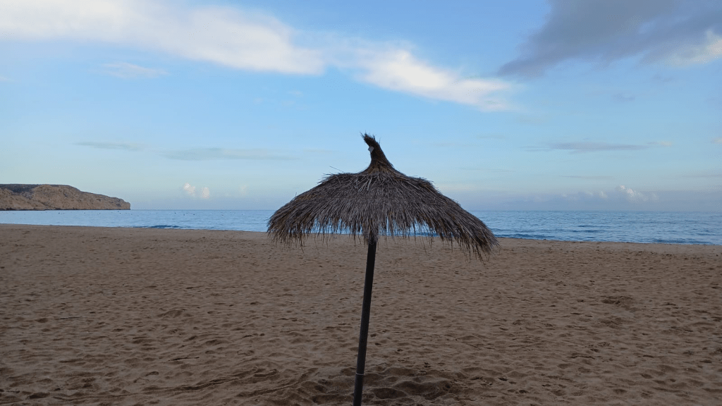 Aber ich schweife ab. Vom Parkplatz aus sind es nur noch wenige Meter bis zum rauch- und hundeftreien Strand. Jetzt im November ist dort quasi gar nichts los, was den Strand aber nur noch schöner macht. Mit den Füßen kann man durchaus ins Wasser gehen. Sooo kalt ist es gar nicht. Wir haben ungefähr 20 Grad und deutlich Wind. Eine Jacke schadet nicht, ist aber gleichzeitig fast zu warm.