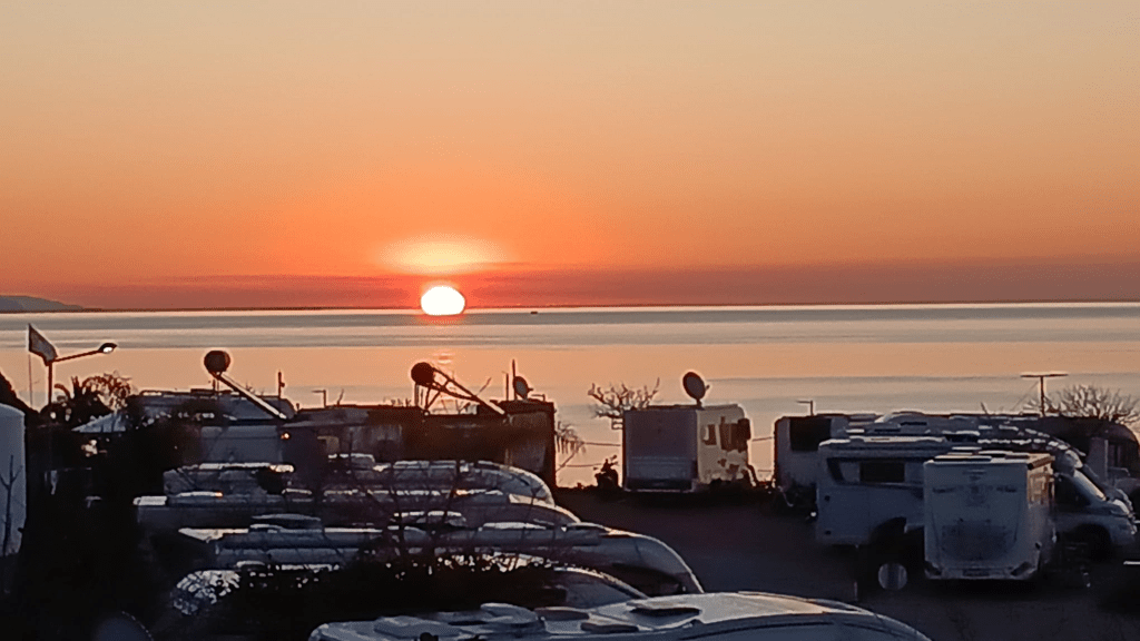 Hier in Torreguardiaro ist es heute in der Früh noch bedeckt mit afrikanischen sandgefüllten Wolken bei 11 Grad und kaum Wind. Wir können hier am Parkplatz kostenlos stehen. Einige hier stehen sogar schon seit Wochen. Eigentlich ist auf 2 m Höhe begrenzt, die Begrenzung ist jetzt in den Wintermonaten aber abmontiert. Einheimische junge Leute freuen sich offenbar weniger über die Camper. Nachts fahren einzelne Autos und Roller hupend über den Parkplatz und bis Mitternacht wurde auf dem Parkplatz noch laut herumgeschrien. Vielleicht war das aber auch nur ein Einzelfall. Wir werden sehen. Zwei Nächte wollen wir mindestens bleiben.