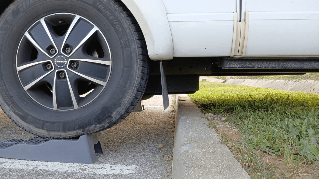 Einige stehen hier quer über mehrere Parkflächen und auch schon längere Zeit ohne Beanstandung. Wir haben uns aber doch entschieden die Parkmarkierung einzuhalten. Dabei hat Christine rechtzeitig entdeckt, daß der Abwassertank am Randstein anstoßen würde. Aber mit Keil geht das. Und man liegt auch besser im Bett ![]()