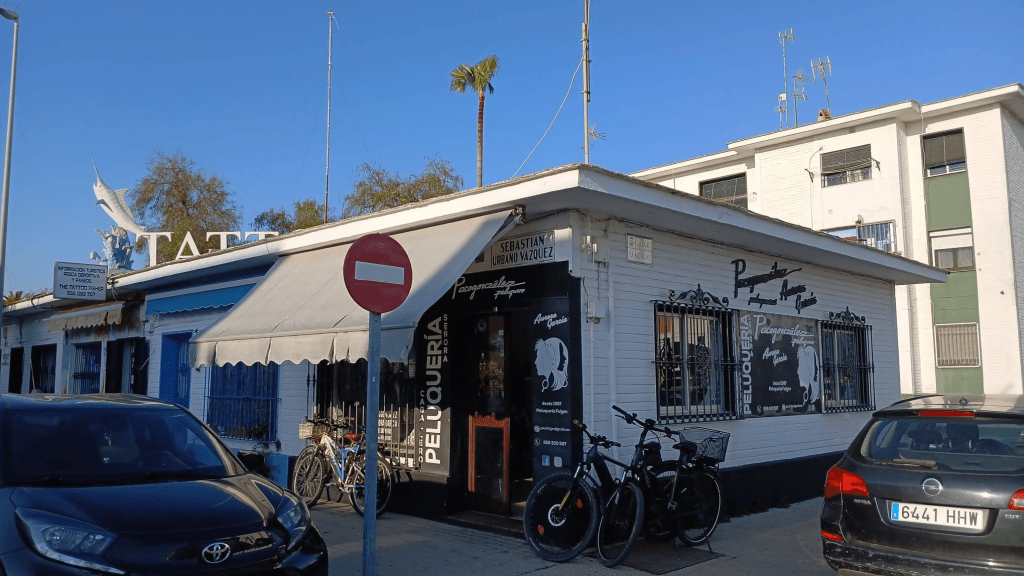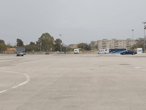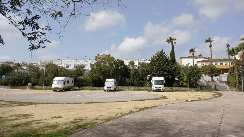 Auf dem kostenlosen Park-/Stellplatz in der Calle Miguel de Unamuno, 11405 Jerez de la Frontera waren wir deshalb nicht lange. Das ist ein großer Parkplatz. Busse stehen da. Ein paar WoMos parken. Einzelne Autos drehen ihre Runden, vielleicht Fahrübungen als Ergänzung zur Fahrschule. Andere stehen am Rand und die Insaßen hören Musik.