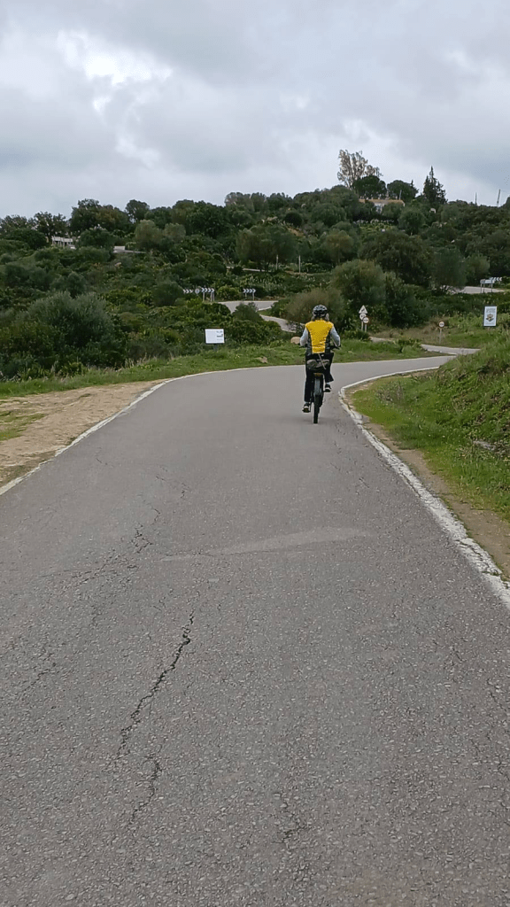 Vom Stellplatz bis zum eigentlich ursprünglichen Burgdorf Castellar de la Frontera sind es vorbei an Korkbäumen ca. 10 KM und exakt 449 m kurvig bergauf. Mit dem E-Bike locker zu schaffen. Ohne E-Unterstützung ist’s natürlich anstrengender. Runter ist es dann ein Spaß. Es gäbe oben zwar ein paar wenige Parkplätze, die unserer Meinung nach aber nicht WoMo-geeignet sind.
