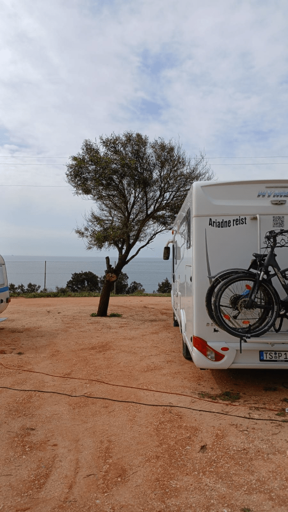 Der Platz kostet 14 Euro und mit Strom 16,50 Euro. Aktuell sind vielleicht 3 oder 4 Plätze von 55 frei. Wir stehen hier etwa 15 m über dem Meer – es geht also zum Strand runter.