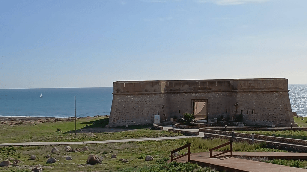 Das „Schloss der alten Wachen“ bzw. das „Castillo de Guardias Viejas“ von 1769 liegt etwa 4 Kilometer vom Camping Mar Azul Balerma entfernt und ist über den Radweg schnell zu erreichen. Wir sind etwas unkonventionell über einen Fußweg hoch, so daß wir wegen des Sandes und der Treppenstufen etwas schieben mussten, was aber nicht schlimm war. Gut, das Schloß ist kein Flughafen oder Bahnhof, aber ich möchte erwähnen, daß die Bauzeit nur 4 Jahre – mit Planung 5 Jahre – betragen hat. Sein Bau basierte nämlich auf einer Verordnung, die 1764 unter der Herrschaft Karls III. verkündet worden war.