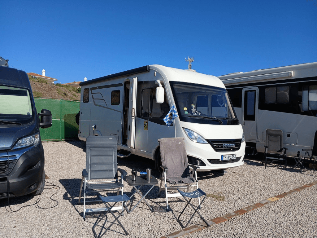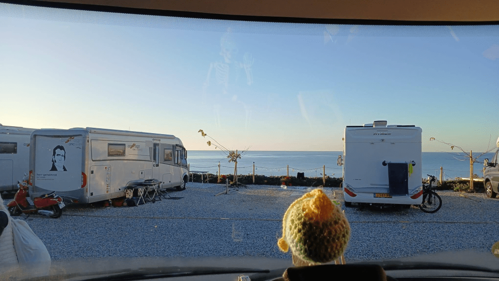 Erst haben wir gefürchtet, daß wir weiterziehen müssen, aber dann wurde doch wieder ein Platzerl frei. Nochmal oben auf dem Balkon, diesmal auf Platz 24. Gut so, jetzt können wir das grauslige Wetter aussitzen, das Portugal und den Westen Spaniens aktuell heimsucht.