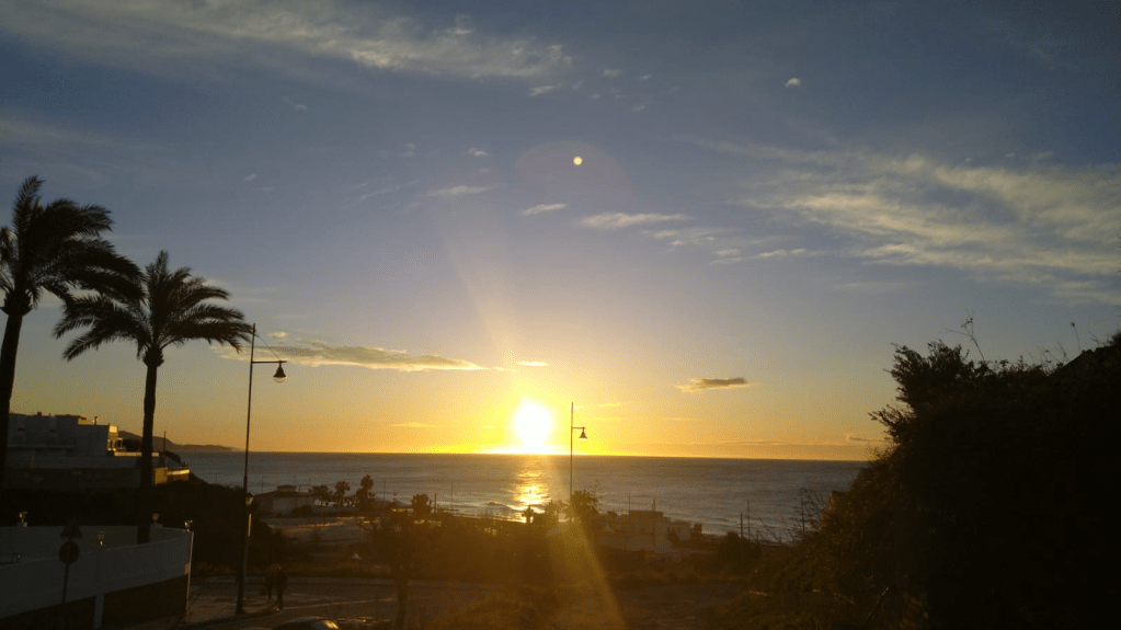Wir erfahren, daß in Torrox die meisten deutschen Auswanderer leben. Mehr als 3000 sollen es sein. Genug Wohnraum wurde offensichtlich in den letzten Jahren geschaffen. In der sehr freundlichen Rezeption wird deutsch gesprochen. Neben der Rezeption warten Tausch-Bücher auf Leser. Am ersten Abend waren wir schon spazieren und konnten der Sonne beim Sinken zusehen. Vorne am Leuchtturm bewunderten wir das faszinierende Abendrot. Wir waren da vorne auch überrascht, weil wir sehr viele freistehende WoMos in Strandnähe gesehen haben, die offensichtlich geduldet werden.