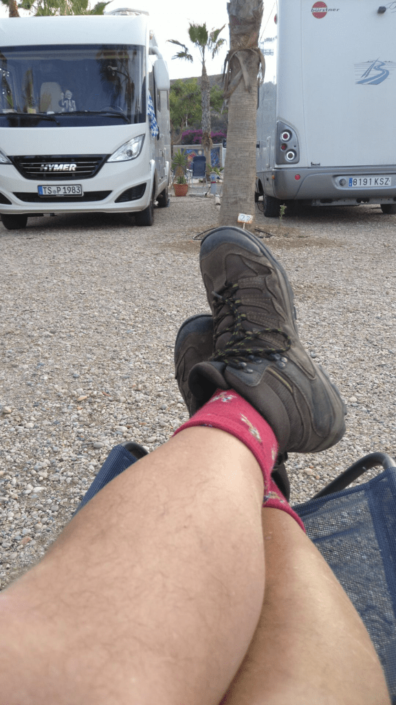Wir stehen mit Ariadne also oben auf dem sogenannten Balkon in zweiter Reihe auf Platz 20 und haben genug Platz, um Tisch und Stühle aufzustellen. Zwei Nächte können wir bleiben. Dann ist der Platz schon wieder reserviert.